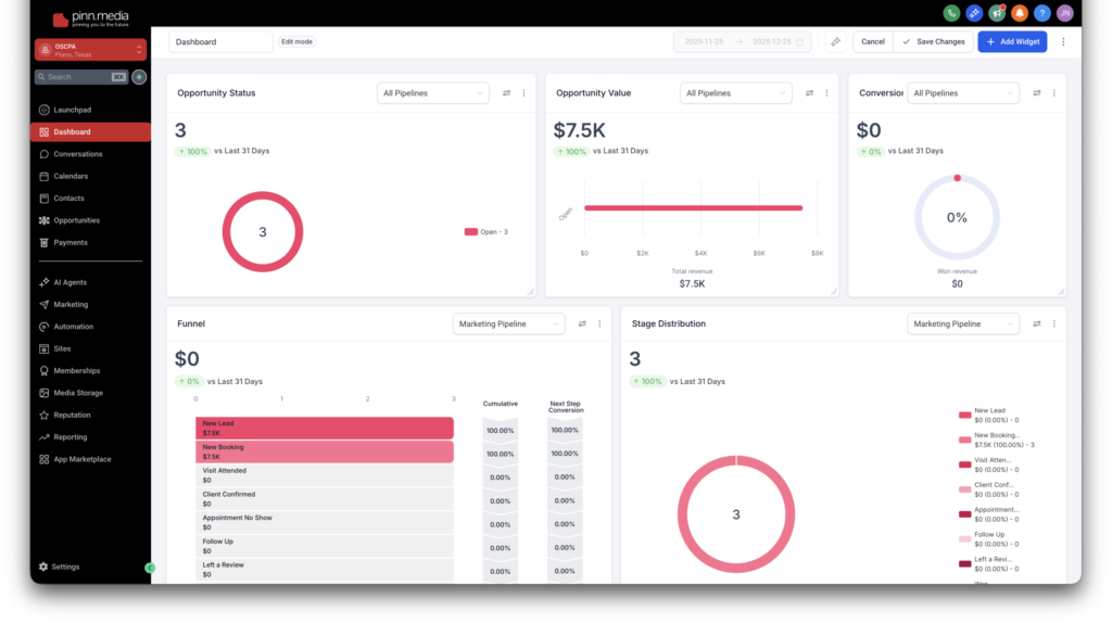 Pinn Media CRM is an all-in-one platform that helps you manage clients, automate workflows, handle bookings, run marketing campaigns, build funnels, and more, everything in one dashboard to save time and increase revenue.